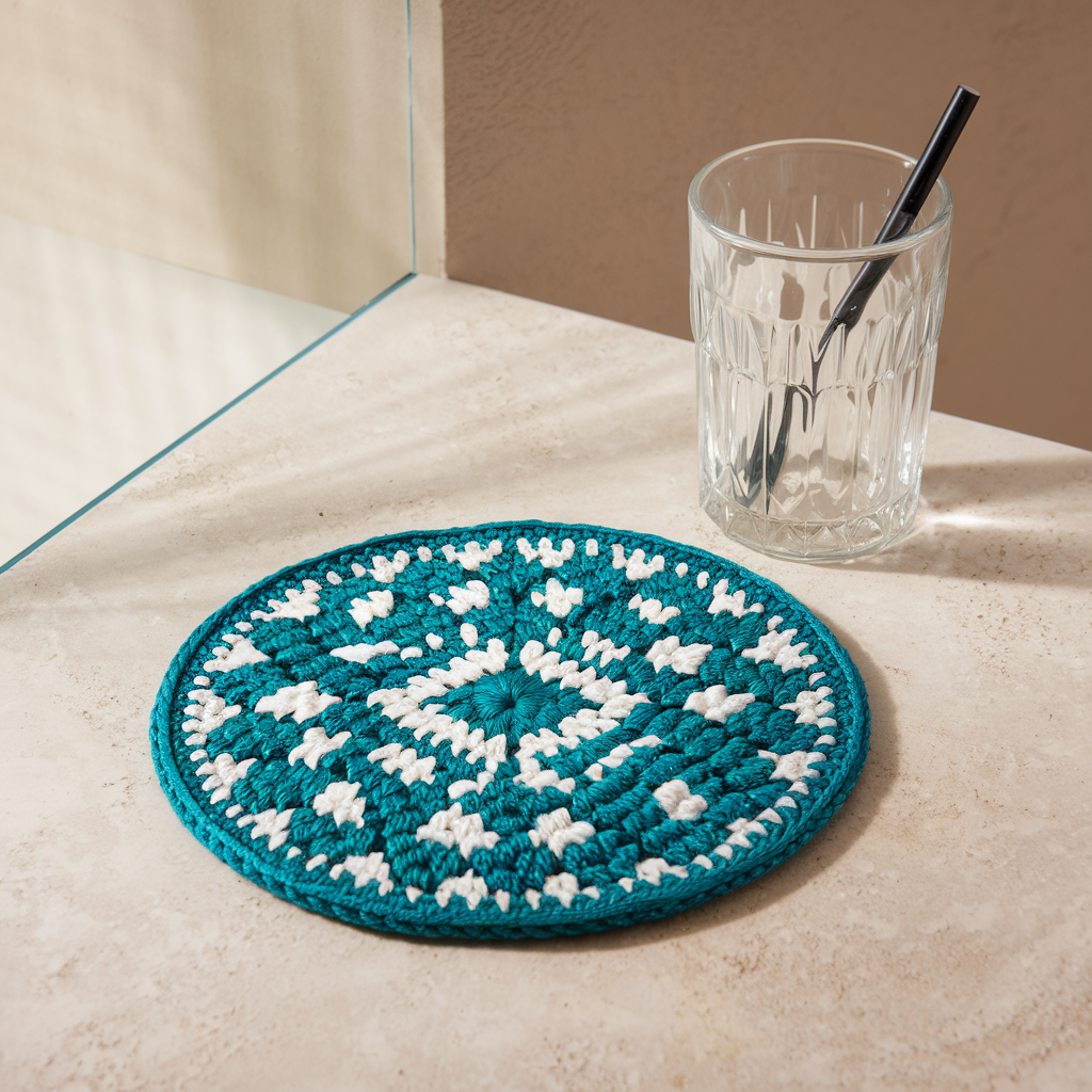 - Weave ends, block flat. Optional: glue or sew a small felt circle on underside for table protection. Make a set of four in different colors.