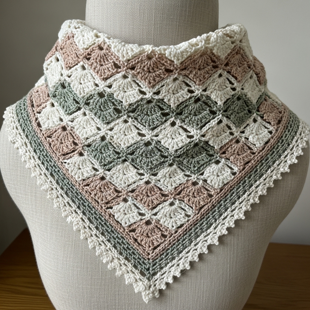 Style & mood: A modern, slightly asymmetrical bandana inspired by delicate lace with accent rows; name used here to denote a specific constructed balance of openwork and solid bands.