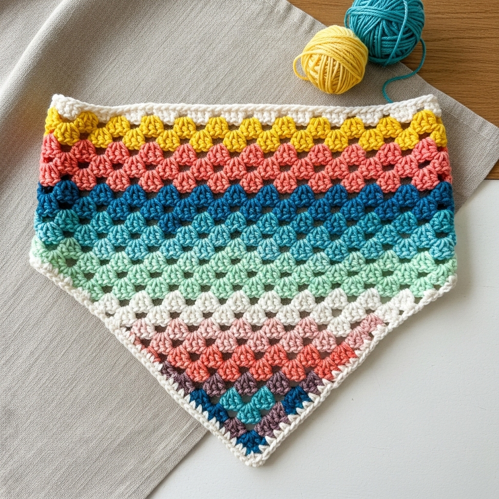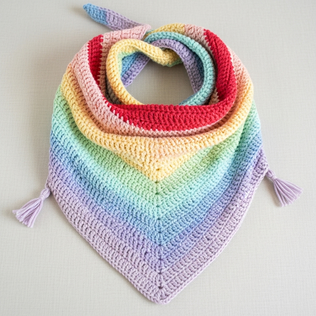 - Work horizontally striped triangular bandana using color changes every few rows in rainbow order, or use self-striping gradient yarn for smooth transitions.