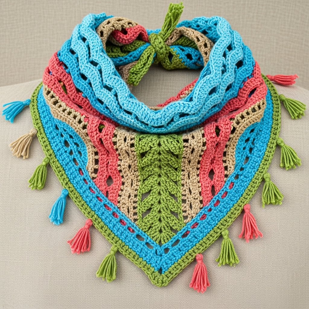 Style & mood: Colorful, tropical-inspired boho bandana with openwork and textured stitches that mimic waves and palm fronds.