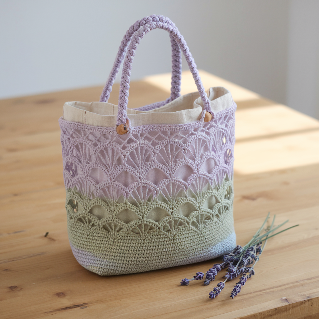 Airy lacy panels inspired by lavender rows — a light summer tote that still carries your market haul if lined.