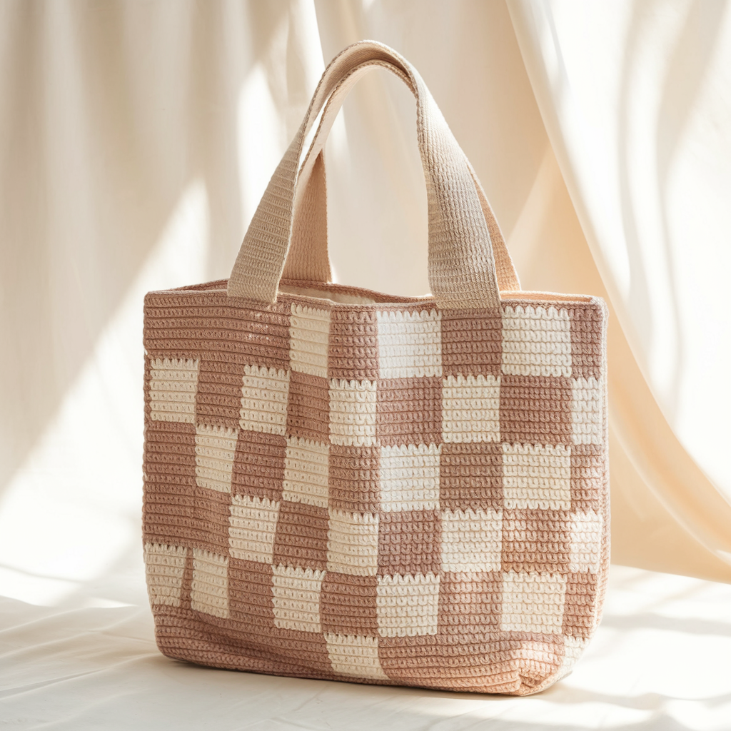 Clean, modern gingham blocks built from color-block granny or mosaic slip-stitch — great for grown-up, graphic totes.