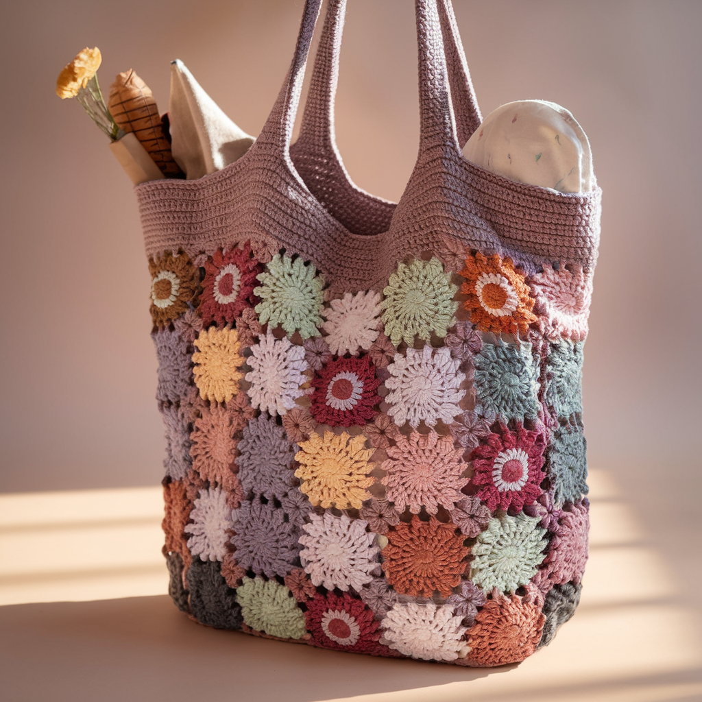 A market tote constructed from joined motifs (flowers, hexagons, octagons) for a boho-chic market bag.