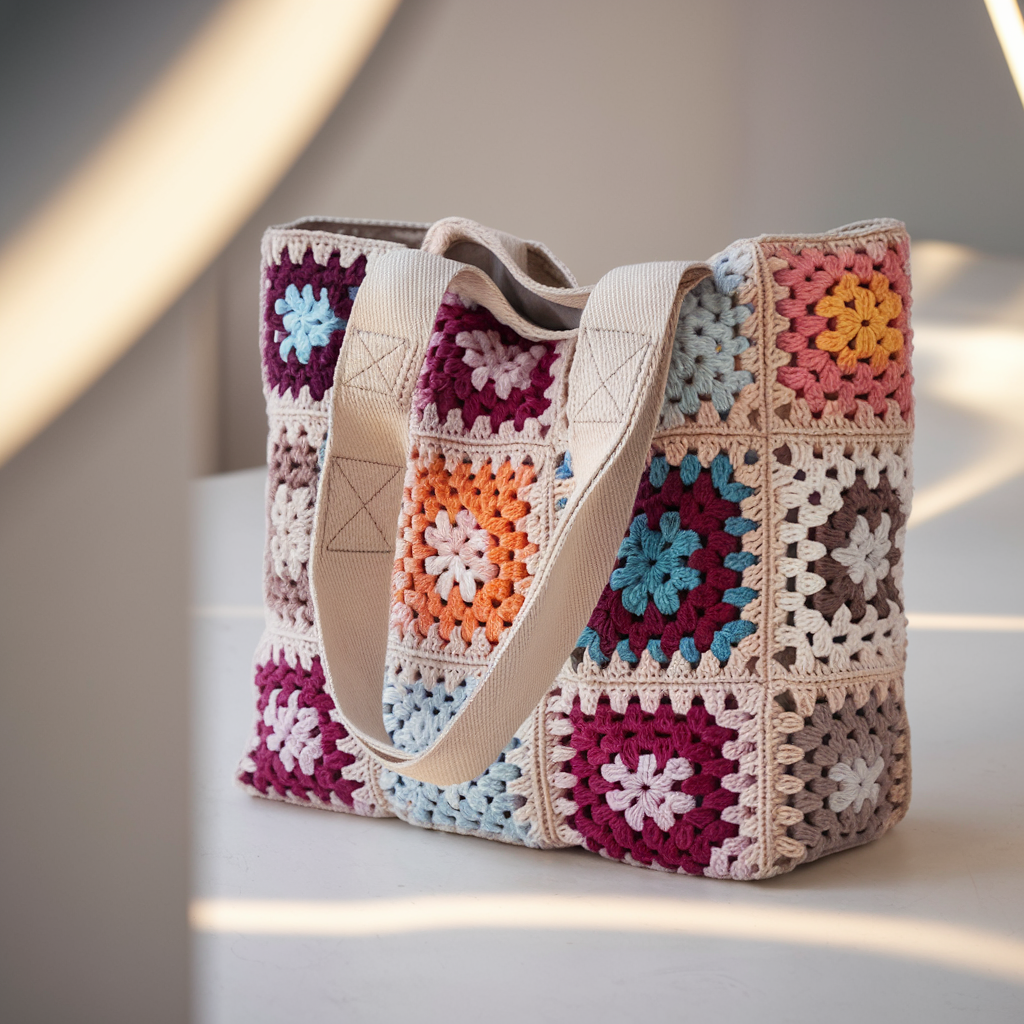 A granny-square market tote with modern palette and a thick, supportive strap — classic but useful.