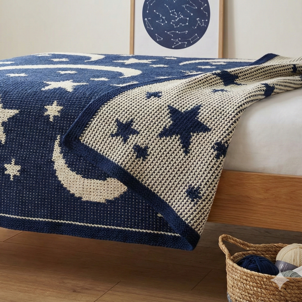This blanket is worked primarily in Tunisian Simple Stitch (TSS), which creates a smooth, flat surface ideal for charted motifs. Moon and star designs are formed using color changes on the forward pass.