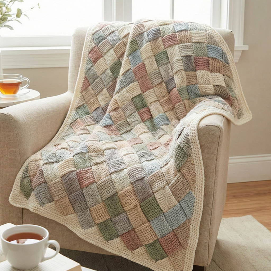 Entrelac creates a woven, basket-like appearance using small connected blocks worked in Tunisian Simple Stitch.