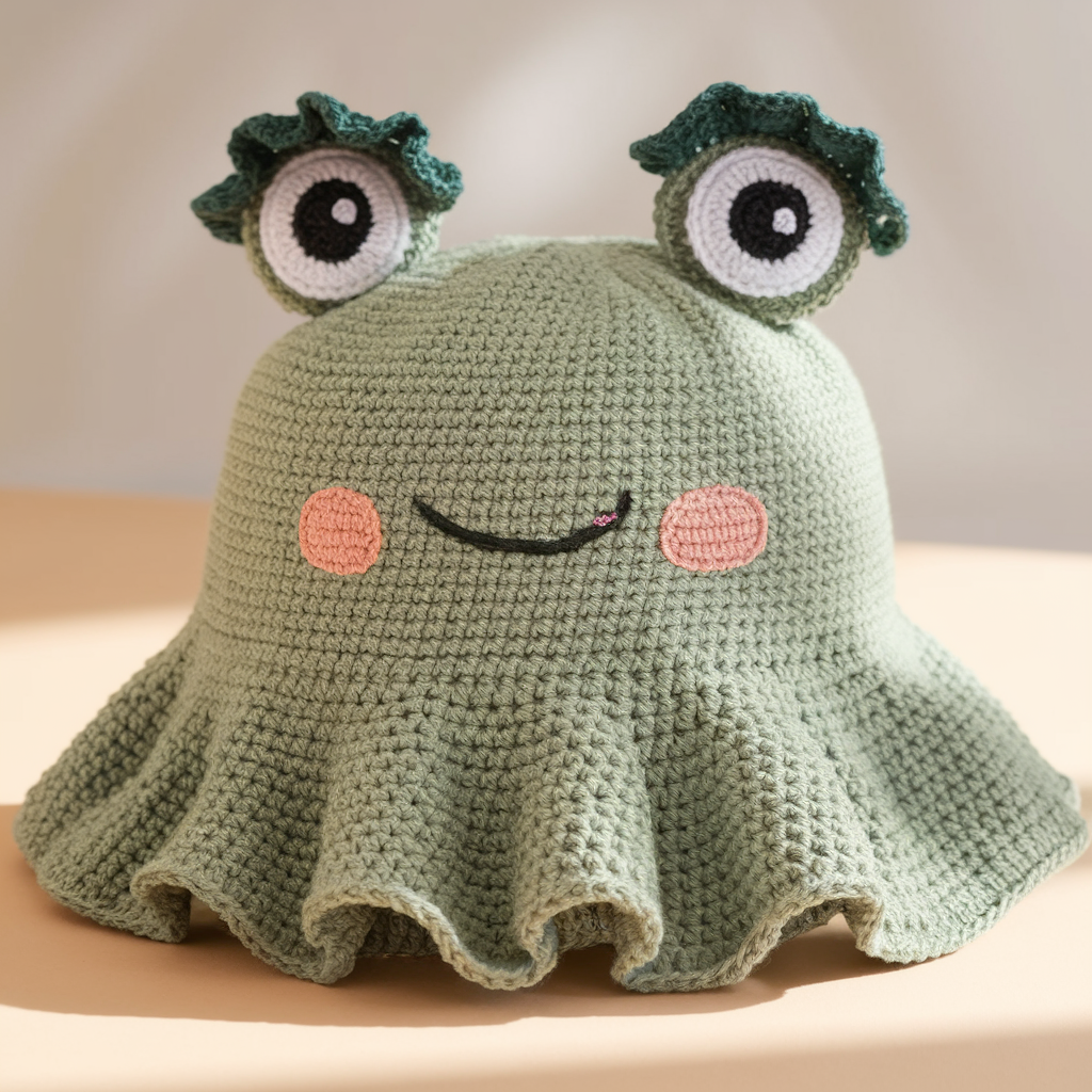 - A ruffled brim in three layers: sc base, then hdc/2hdc increases, then outer scallop layer with 3–5 dc clusters. This creates a playful, lily-pad-like rim that suits frog aesthetics.