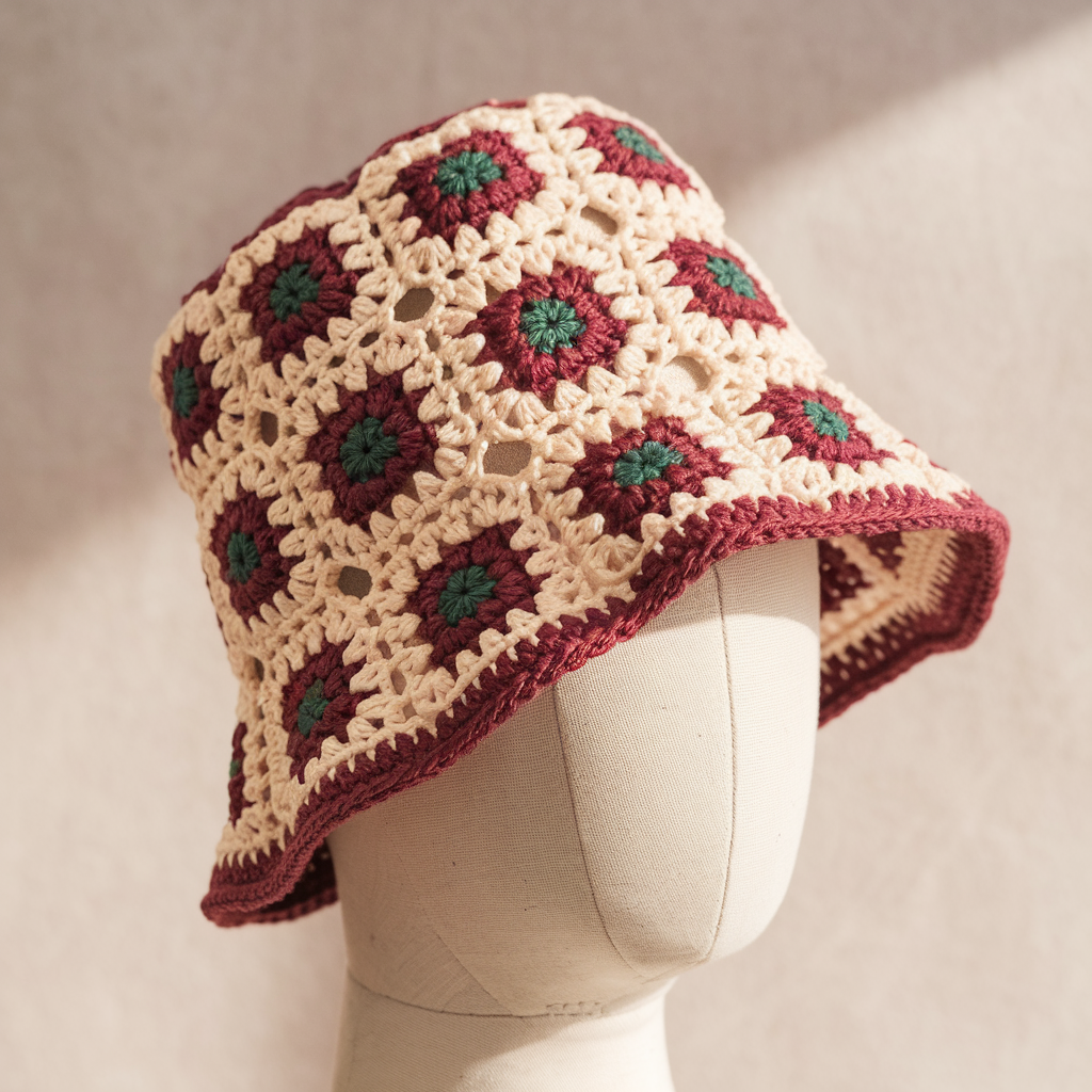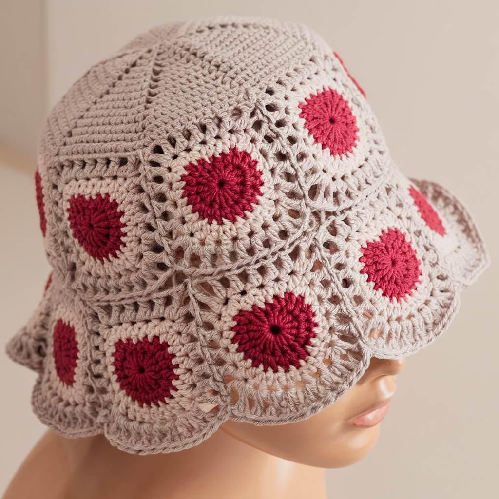 1. Crochet Cherry Granny Square Bucket Hat Pattern