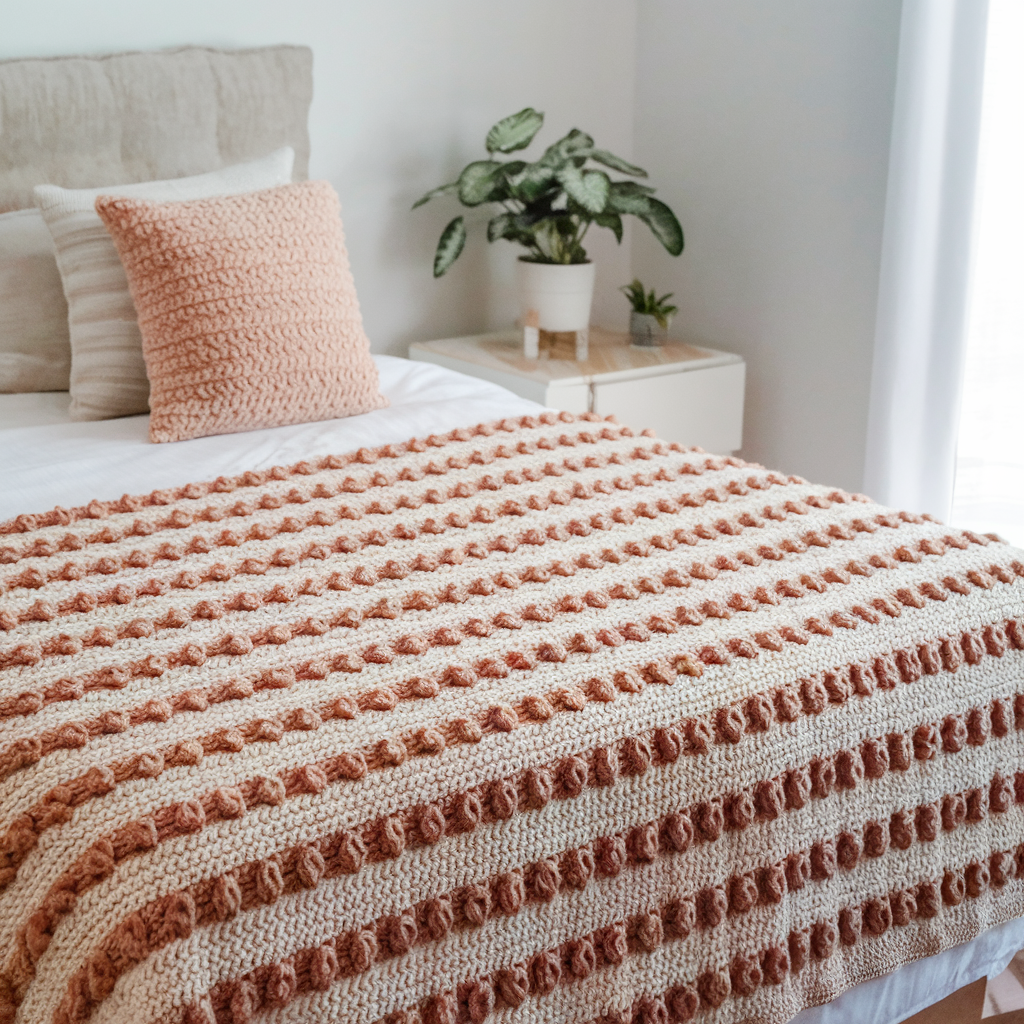 - Base: Work a striped or solid blanket in dc to your size. Example: Make a 50″ x 60″ throw in broad stripes of Color A and B, alternating every 10 rows.