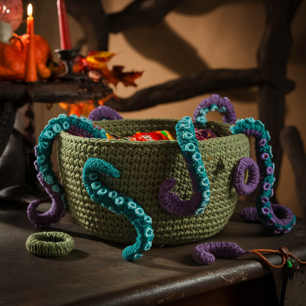 A dramatic candy bowl whose exterior is wrapped in soft tentacles — perfect for Halloween candy and theatrical table decor.