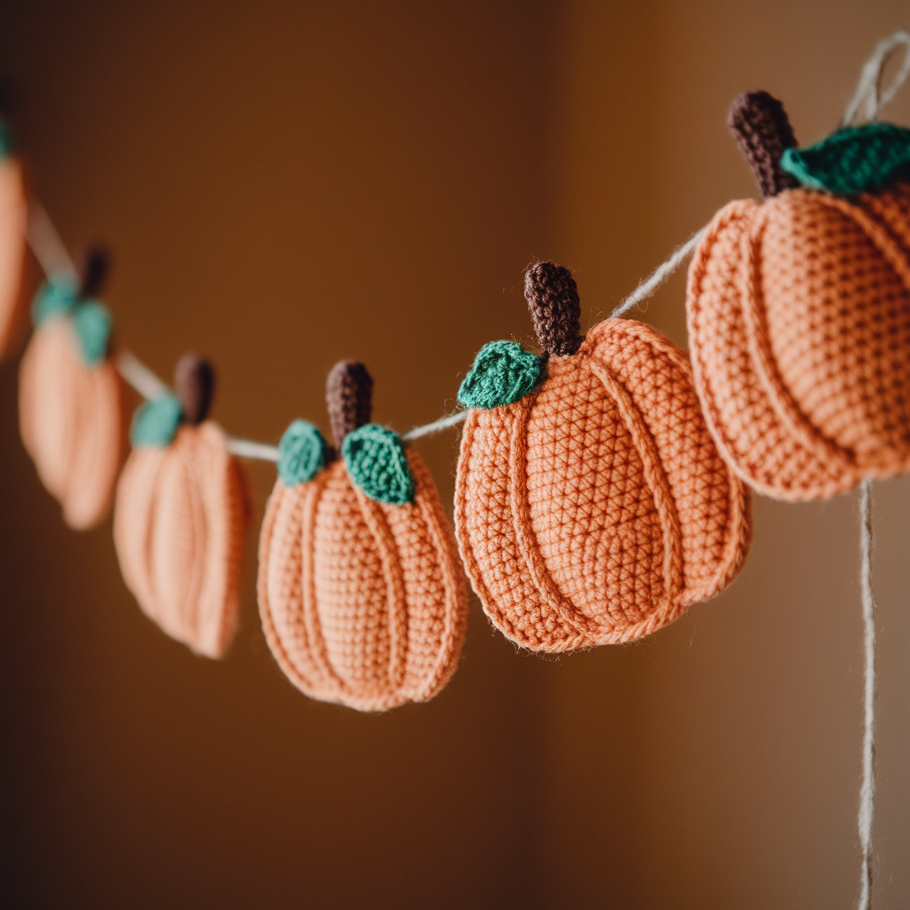 - Alternate pumpkins with crochet skull medallions or tiny witch hats.