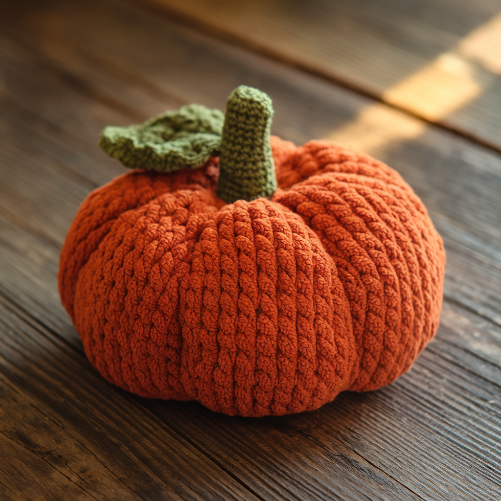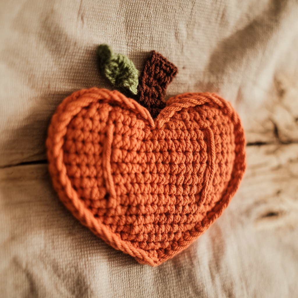 - Round 4: Sc around in back loops only to create a slightly cupped shape (18 sc). Stuff very lightly with fiberfill. Run long tail through center pulling to form segments (6–8 segments). Sew stem: ch 4, sl st back into 2nd ch to make short stem; add a small leaf: ch 6, sc in 2nd ch, hdc next, dc next, sl st. Attach to pumpkin and sew pumpkin onto cozy.