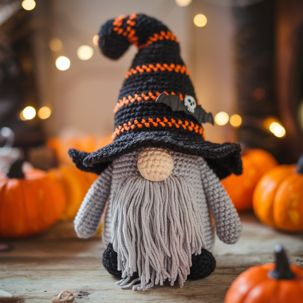 Gnomes are an adorable trend in seasonal decor—this Halloween gnome sports a spooky hat and beard.